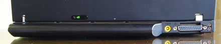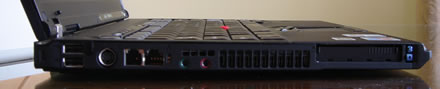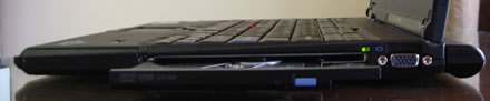 Below are some pictures of each side of the ThinkPad T43, note that I have the optional 9-cell extended life battery installed so the battery sticks out, the regular 6-cell battery is flushed with the back of the T43: