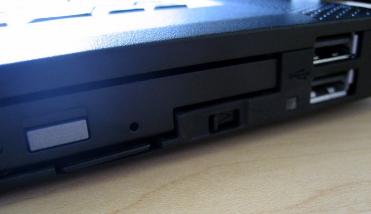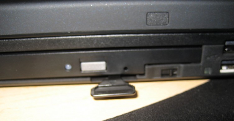 UltraBay: The LED to the left of the 2 USB ports lights up when the unit is powered on and there is a device in the UltraBay, which in this case is the DVD Burner. Pressing the switch to the left of it releases the lever underneath the burner, allowing you to hot-swap and pull out UltraBay devices with the laptop still on.
