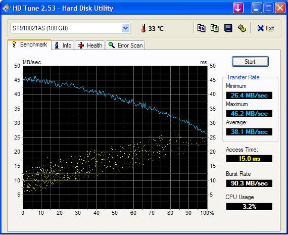 The Seagate 7200 RPM HDD is extremely repsonsive and quick. It is also very quiet in comparison to the Hitachi 7K100 that my roommate has in his Precision M65. The Active Protection System is also responsive, parking the heads of the hard drive to prevent damage when it detects any sudden movements. Following is the performance results from HDTune for the hard drie: