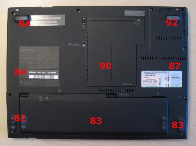 Lenovo offers the choice of either a 3-cell or 6-cell Lithium-Polymer battery that rests at the front of the notebook. The 3-cell is lighter and has a quoted life of up to 4.3 hours while the 6-cell is heavier and has a quoted life of up to 6.5 hours. You can also get a Lithium-Polymer option bay battery if you pull out the DVD Burner, which is easily done by removing just one screw, and then insert a spare battery instead.