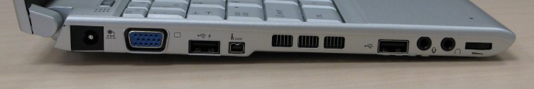 The left side with power jack, VGA port, two USB ports, Firewire, volume control, headphone and microphone ports (view large image)